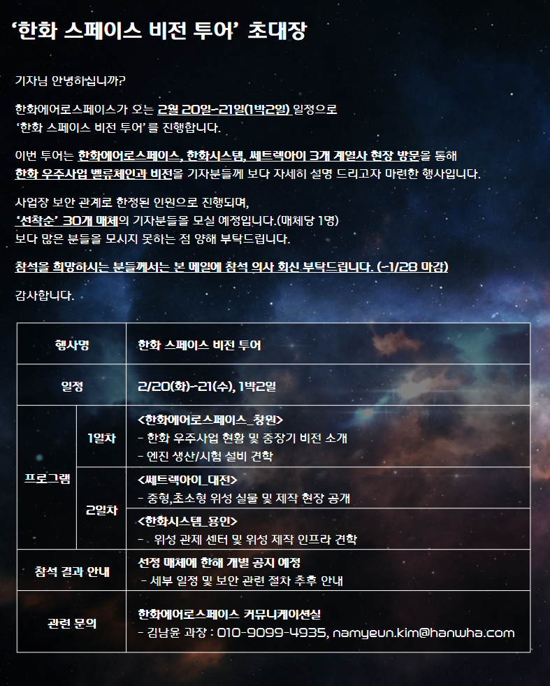 [미디어행사]한화 우주사업 미디어 투어에 기자님을 모십니다.